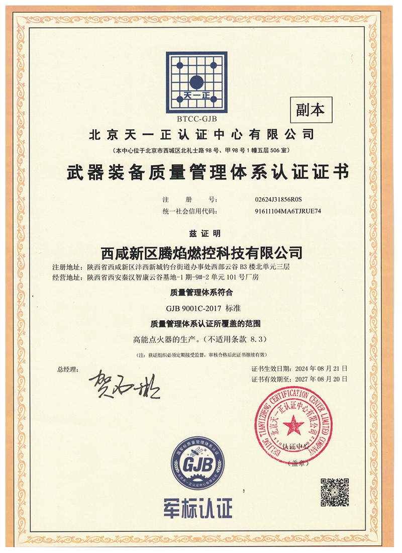 西咸新区腾焰燃控科技有限公司成立于2018年3月。公司主要从事火焰检测器、高能点火器、半导体电嘴、高能点火电缆、高压点火电缆、导电杆、点火枪等燃烧控制系统产品的技术开发、技术转让、生产、销售、安装及技术服务。【西咸新区腾焰燃控科技有限公司】